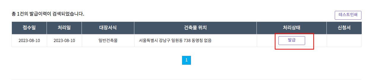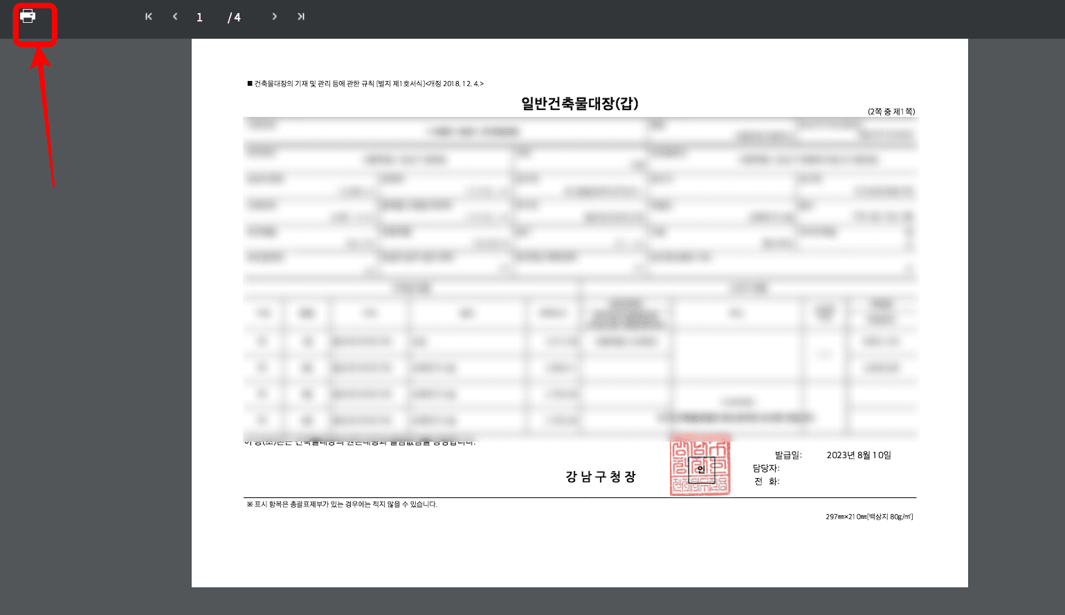 건축물대장 발급이 완료되면 처리상태의 발급 버튼을 클릭합니다. 건축물대장이 화면에 표시되면 좌측 상단의 프린터 아이콘을 클릭하면 출력하면 완료됩니다.