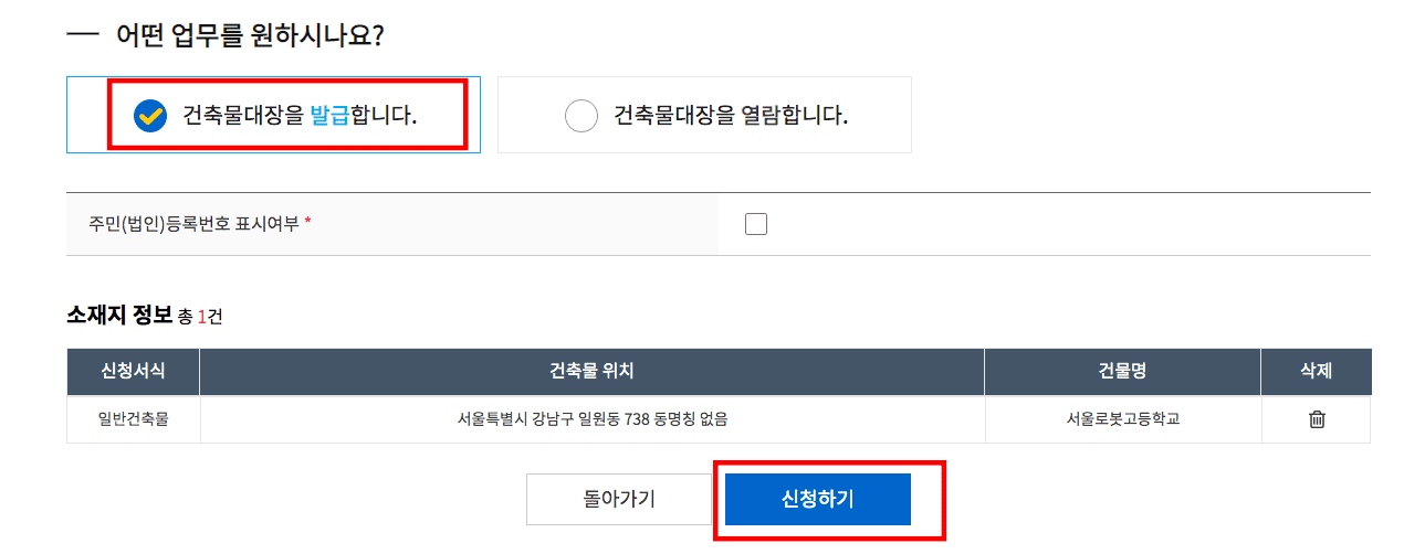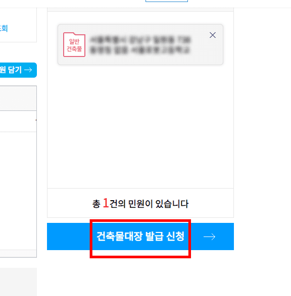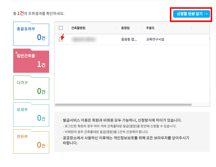 건축물대장 인터넷발급 페이지가 표시되면 건축물 소재지를 입력창에 입력하고 우측의 돋보기 아이콘을 클릭합니다. 건축물이 조회되면 해당 건축물에 체크표시를 하고 우측 상단의 신청할 민원 담기 버튼을 클릭합니다.