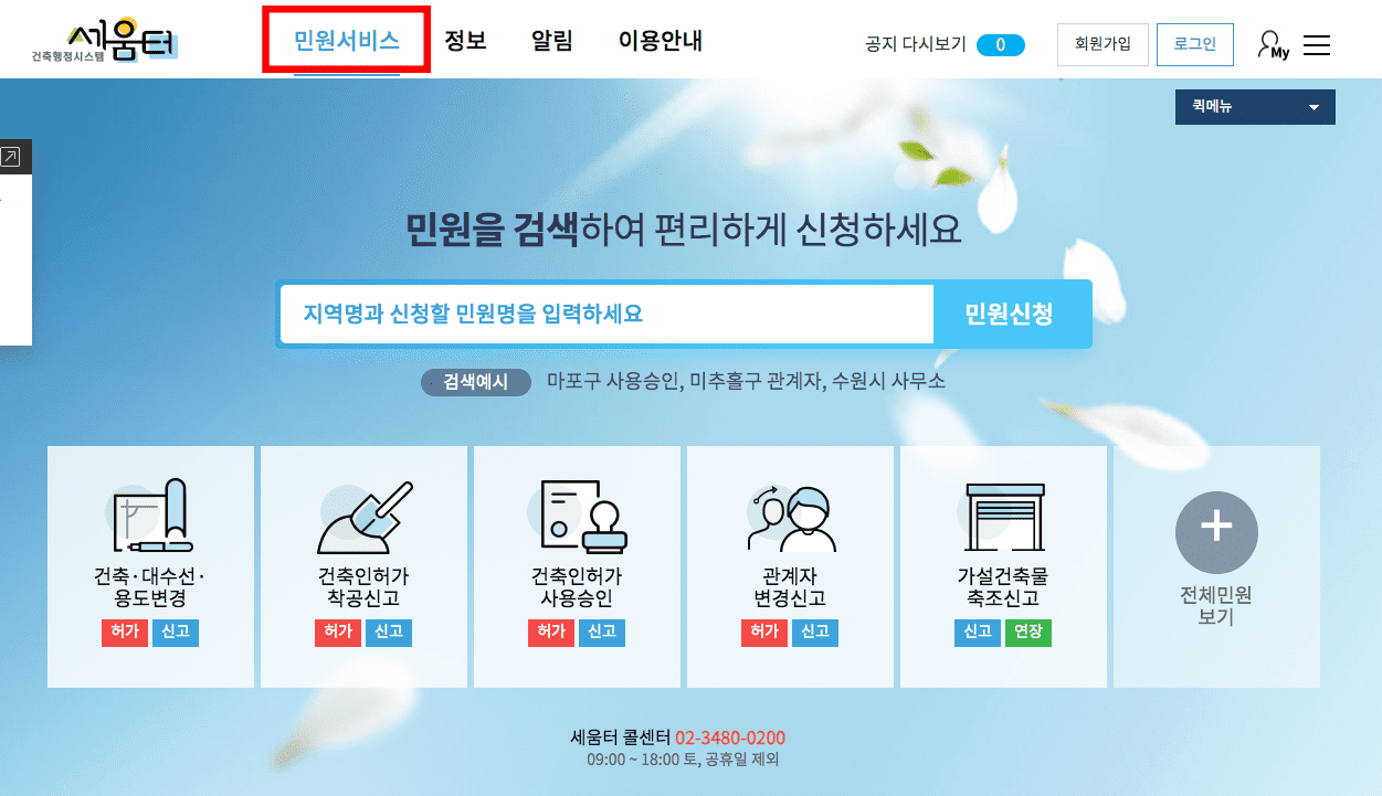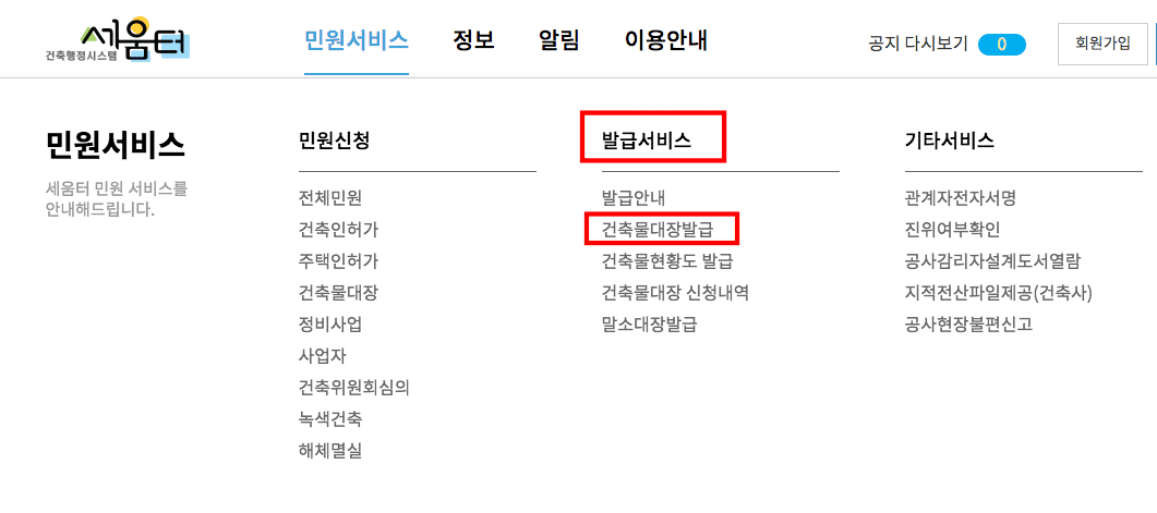 건축행정시스템 세움터 홈페이지에 방문하시면 위와 같은 페이지를 볼 수 있습니다. 먼저 상단 민원서비스 메뉴로 마우스를 이동합니다. 세부 메뉴가 표시되면 발급서비스 > 건축물대장발급 메뉴를 클릭합니다.