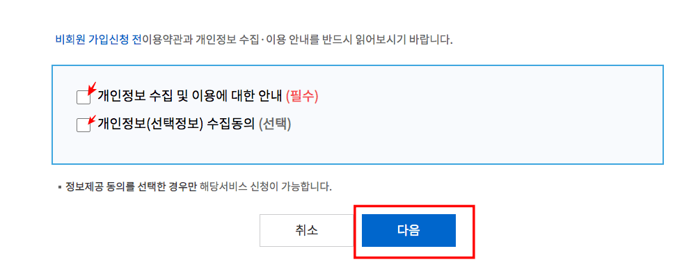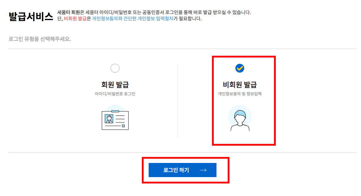 로그인 유형 선택이 표시되면 비회원발급을 선택합니다. 비회원 로그인 필수입력사항인 이름, 주민등록번호, 자동입력방지문자를 입력하시고 아래에서 개인정보 수집 및 이용에 대한 안내 동의를 체크한 후 하단의 다음 버튼을 클릭합니다.