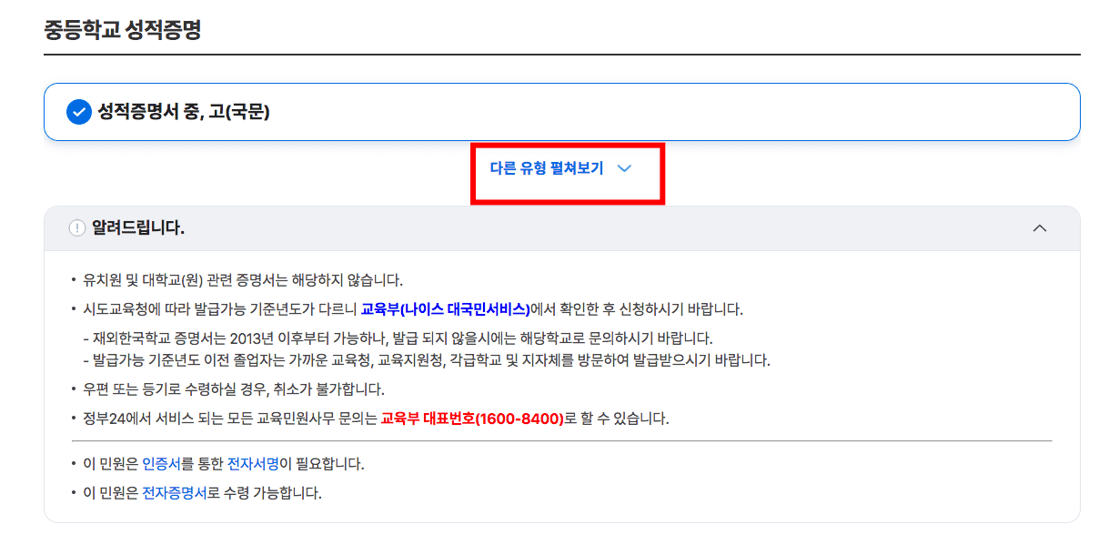 중등학교 성적증명 페이지가 표시됩니다. 하단의 다른 유형 펼쳐보기를 선택하면 영문 버전 선택이 가능합니다.