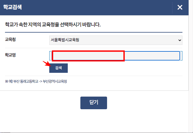 휴대폰에서 인증 메시지가 오면 비밀번호나 지문인식 등의 인증과정을 완료하시고 컴퓨터로 돌아와 하하단의 인증 완료 버튼을 클릭합니다. 다시 학교 검색 창에서 졸업한 고등학교 관할 교육청을 선택하고 하단의 학교명에 졸업한 학교의 이름을 입력하고 하단의 검색 버튼을 클릭합니다.