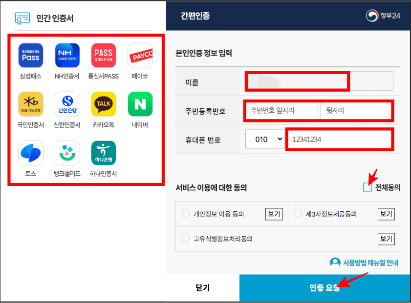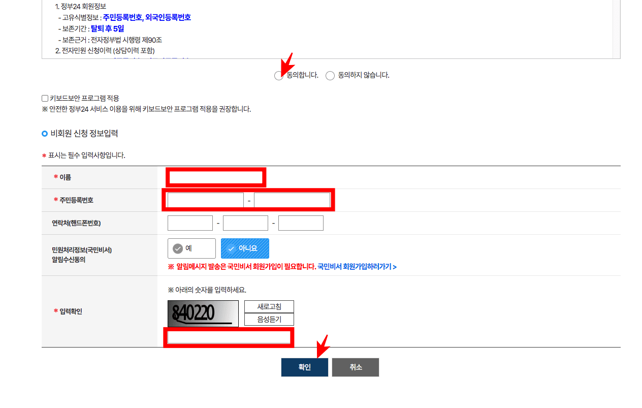 회원, 비회원 신청 창이 표시되면 비회원 신청하기를 선택합니다. 개인정보 수집 및 이용에 대한 동의를 모두 체크하시고 하단에서 이름, 주민등록번호, 입력확인숫자를 모두 입력하시고 하단의 확인버튼을 클릭합니다.