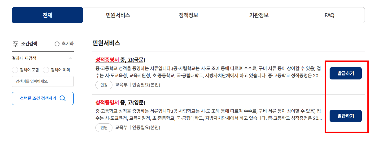 민원서비스 페이지에 국문과 영문의 고등학교 성적증명서가 표시됩니다. 원하시는 발급하기 버튼을 클릭합니다.