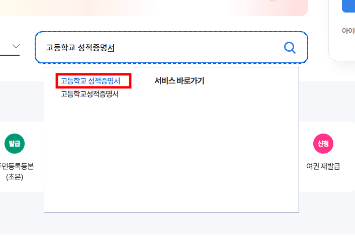 정부 24 홈페이지에 도착하시면 위와 같은 메인화면을 볼 수 있습니다. 화면에 보이는 검색창에 [고등학교 성적증명서]를 입력합니다. 이후 하단에서 고등학교 성적증명서 메뉴를 선택합니다.