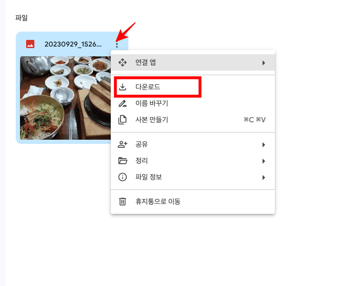 이번에는 업로드한 사진을 다시 다운로드 해 보겠습니다. 테스트 폴더의 뷰어를 미리 보기로 선택한 후 사진 우측 상단의 점 3개를 클릭합니다. 이후 세부 메뉴에서 ‘다운로드’를 클릭합니다.