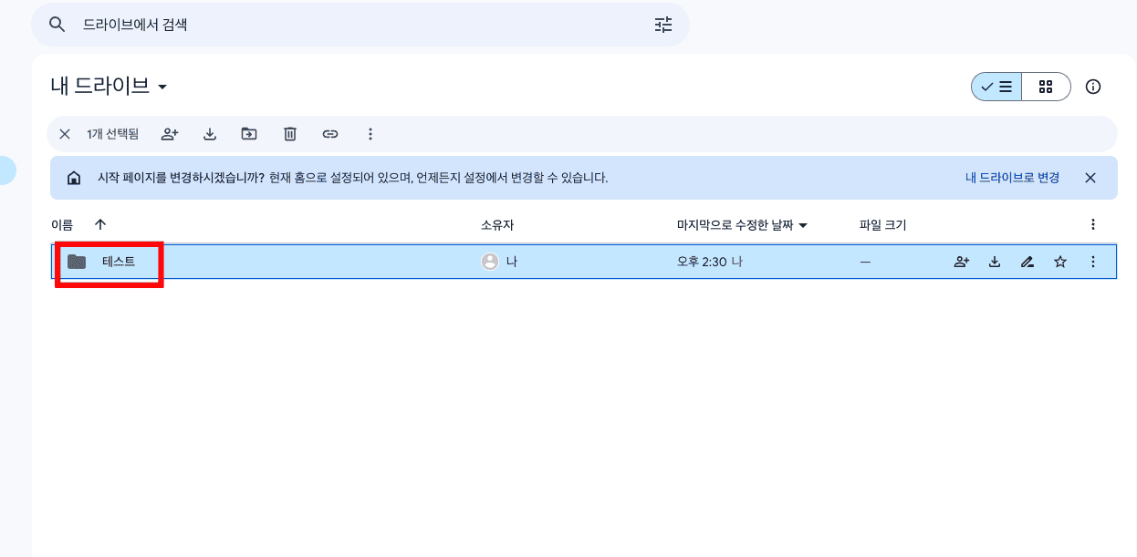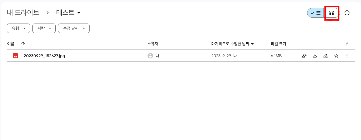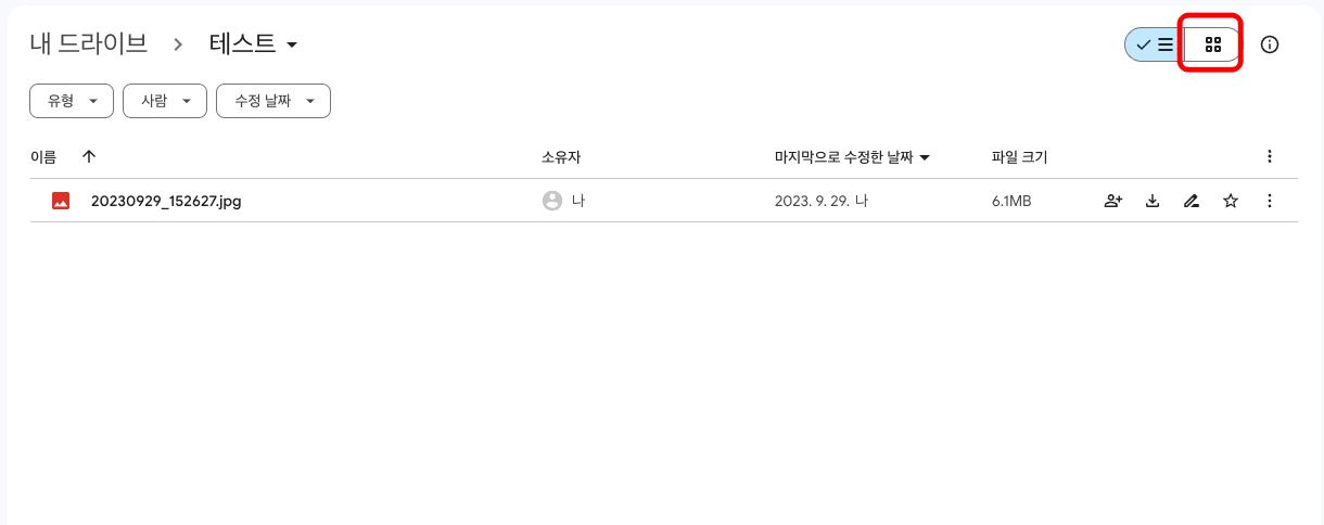 사진 파일 한개가 테스트 폴더에 업로드된 것을 확인할 수 있습니다. 우측 상단에 표시된 아이콘을 클릭하면 사진 미리 보기가 가능한 아이콘으로 표시됩니다.