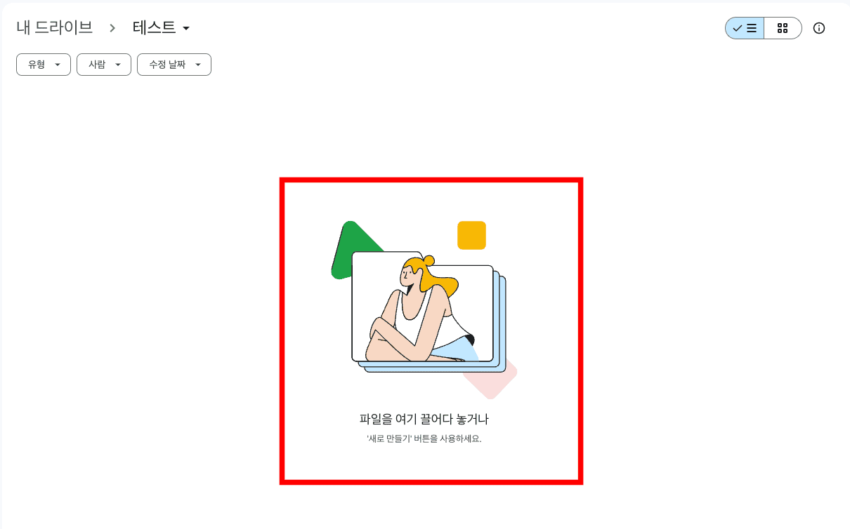 테스트 폴더가 생성되었으면 더블 클릭하여 폴더를 열어줍니다. 빈 공간에 파일을 드래그해서 업로드하거나 좌측 상단의 신규 > 파일 업로드를 선택하여 파일을 업로드합니다.