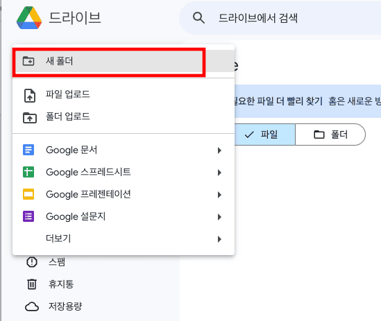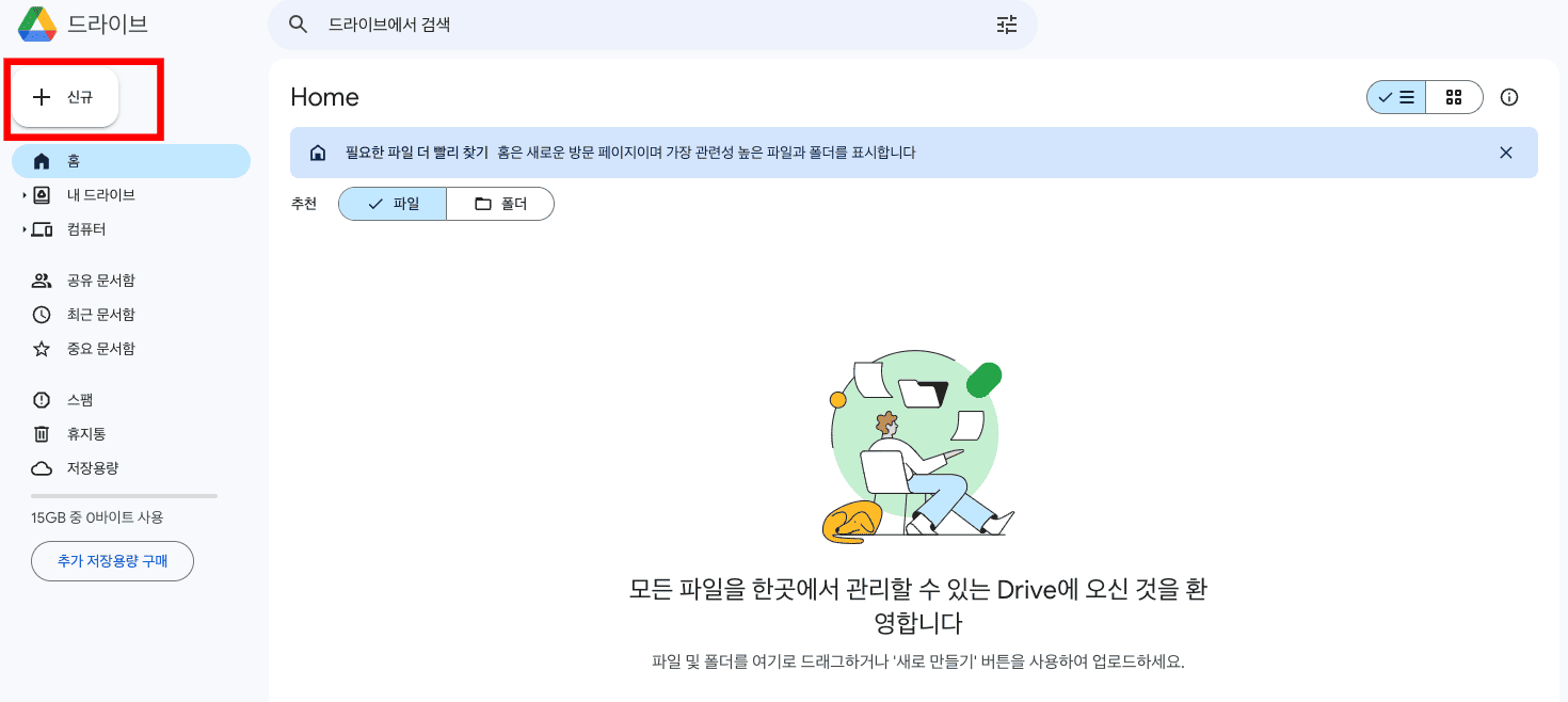 구글 드라이브 홈페이지에 방문하시면 위와 같은 메인 페이지를 볼 수 있습니다. 우측 상단의 드라이브로 이동을 클릭합니다. 드라이브 페이지가 표시되면 좌측 상단의 신규 메뉴를 클릭합니다.