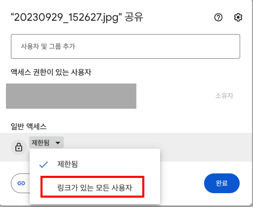 링크가 있는 모든 사용자로 선택하면 해당 링크를 클릭하는 모든 사용자들이 해당 자료에 접속하거나 다운로드할 수 있게 됩니다. 하단에서 완료버튼을 클릭합니다.