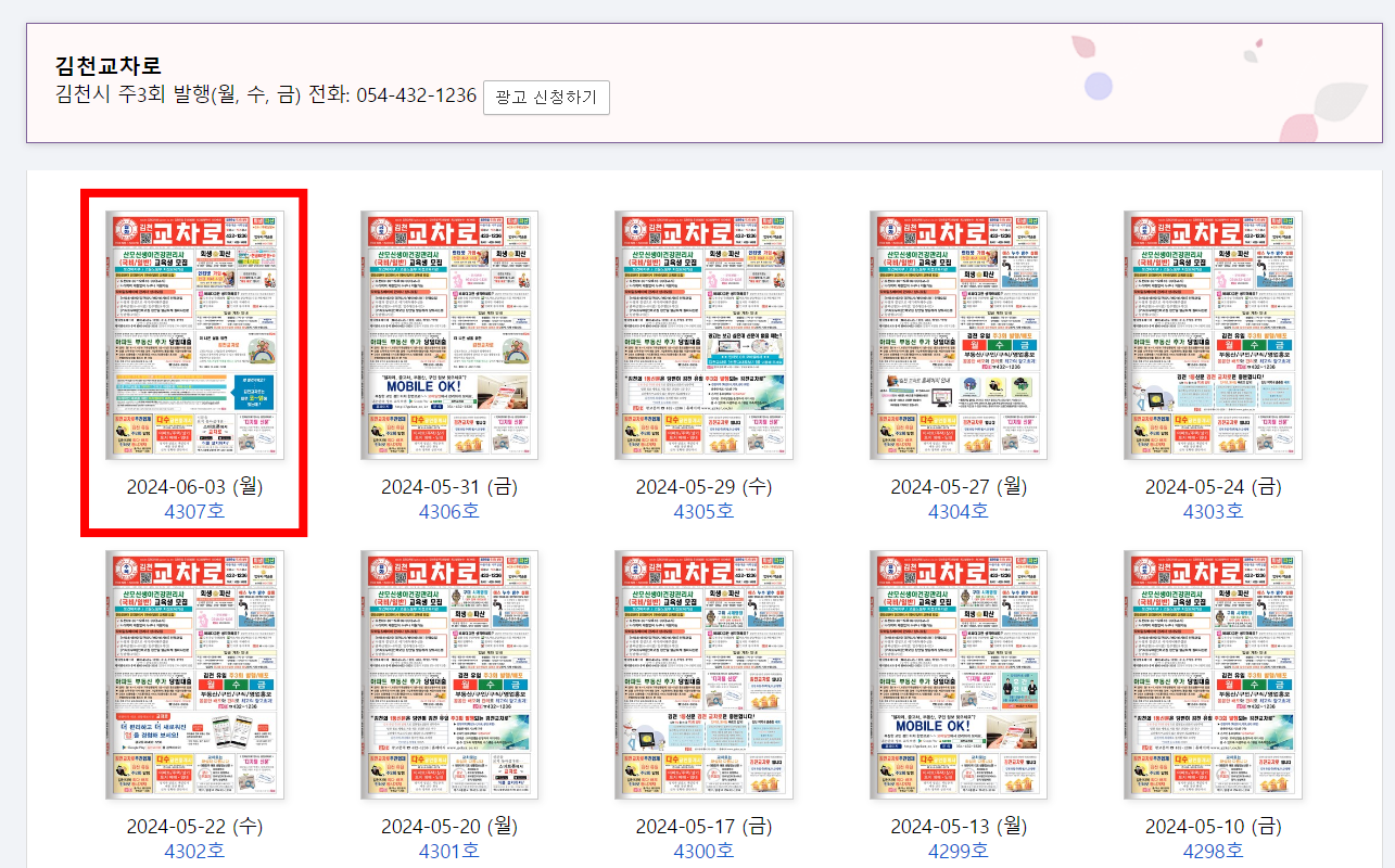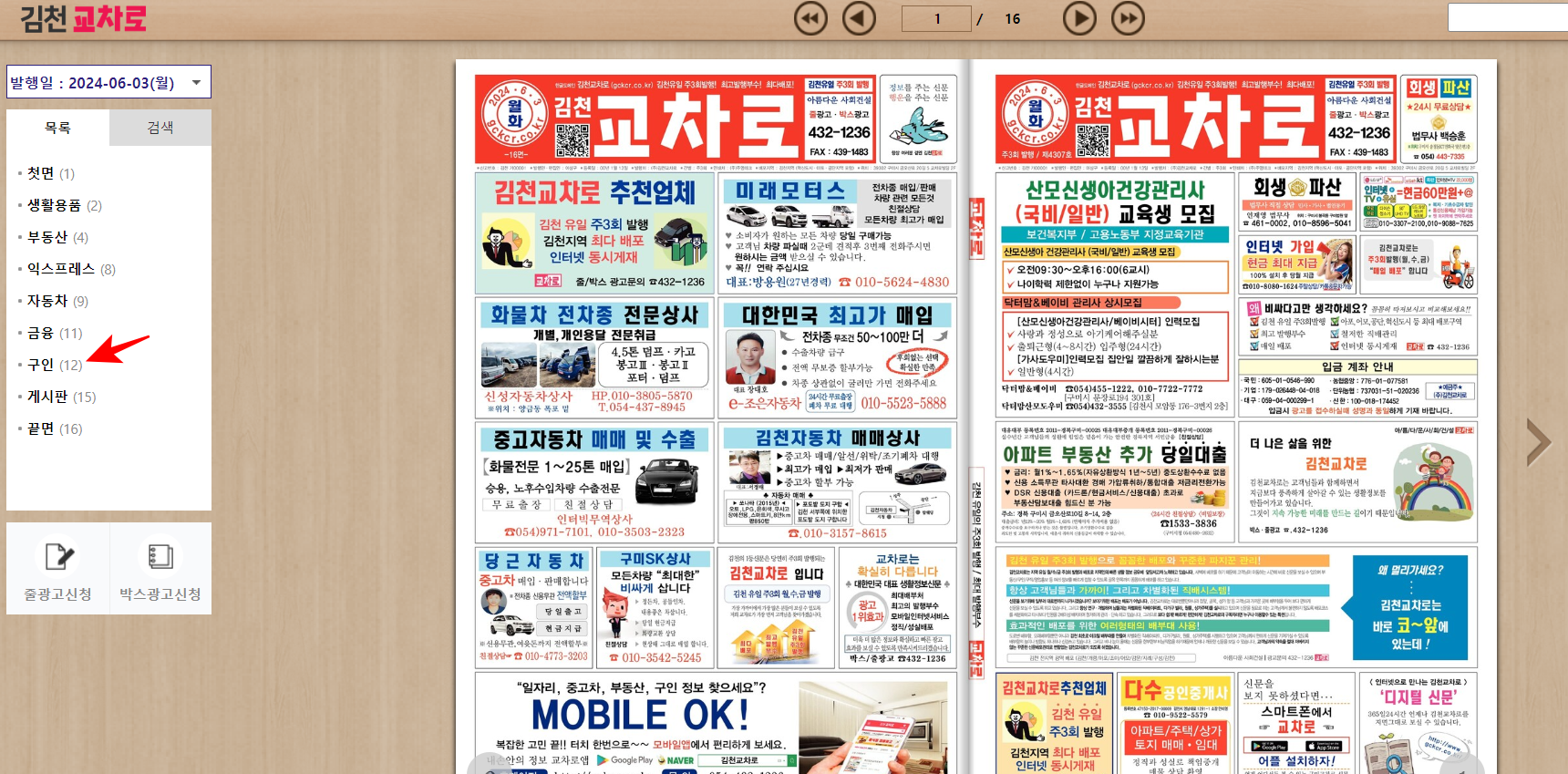 김천 교차로의 최신호를 살펴볼 수 있습니다. 가장 최신 교차로를 선택합니다. 교차로 신문이 컴퓨터 화면에 보여지면 좌측 메뉴에서 [구인]을 선택합니다.