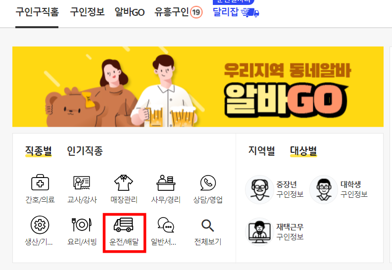 김천 교차로 홈페이지로 이동되면 위와 같은 페이지를 보게 됩니다. 상단 메뉴에서 [e구인구직] 메뉴를 선택합니다. 구인구직 페이지에서 일자리를 검색하려면 직종별, 지역별, 대상별 중 원하는 분류를 먼저 선택합니다. 여기에서는 직종별 > 운전/배달을 선택해 보겠습니다.