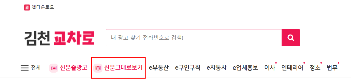 김천 교차로에서 교차로 신문으로 구인구직 정보를 확인하시려면 김천 교차로 메인 페이지로 이동하시기 바랍니다. 이후 상단 메인 메뉴에서 [신문 그대로 보기] 메뉴를 선택합니다.