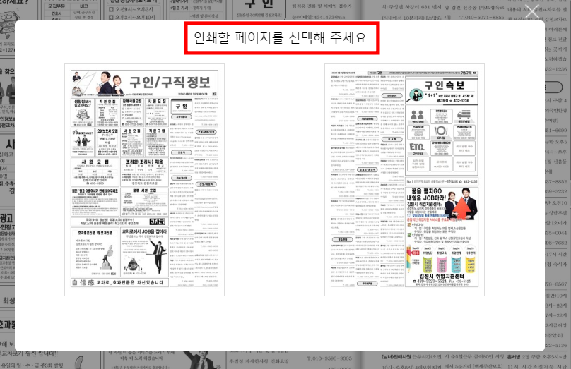 이후 김천 교차로 구인구직 정보가 교차로 신문으로 화면에 보여집니다. 만약 화면의 글씨가 너무 작아서 잘 보이지 않는다면 우측 상단의 [인쇄] 버튼을 클릭합니다. 이후 인쇄할 페이지를 선택하여 인쇄하면 더 자세한 구인구직 정보 확인이 가능합니다.