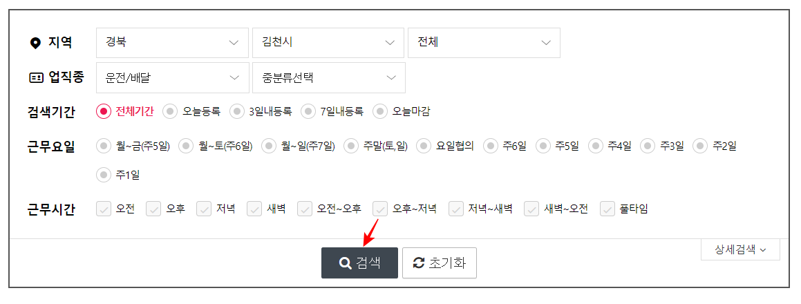 이후 상세 페이지에서 지역 및 직종, 검색기간, 근무요일, 근무시간 등을 상세히 입력하신 후 하단의 [검색] 버튼을 클릭합니다.
