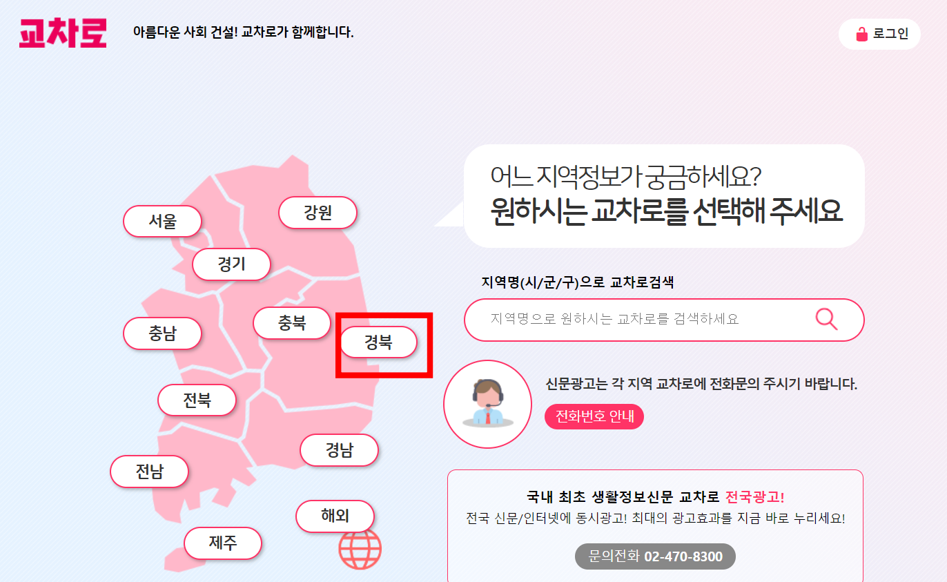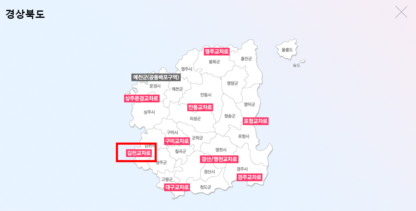 교차로 홈페이지에 도착하시면 위와 같은 메인 페이지 확인이 가능합니다. 좌측 전국 지도에서 김천시가 속해 있는 [경북]을 선택합니다. 이어 경상북도 지도가 표시되면 좌측 하단에서 [김천 교차로]를 클릭합니다.