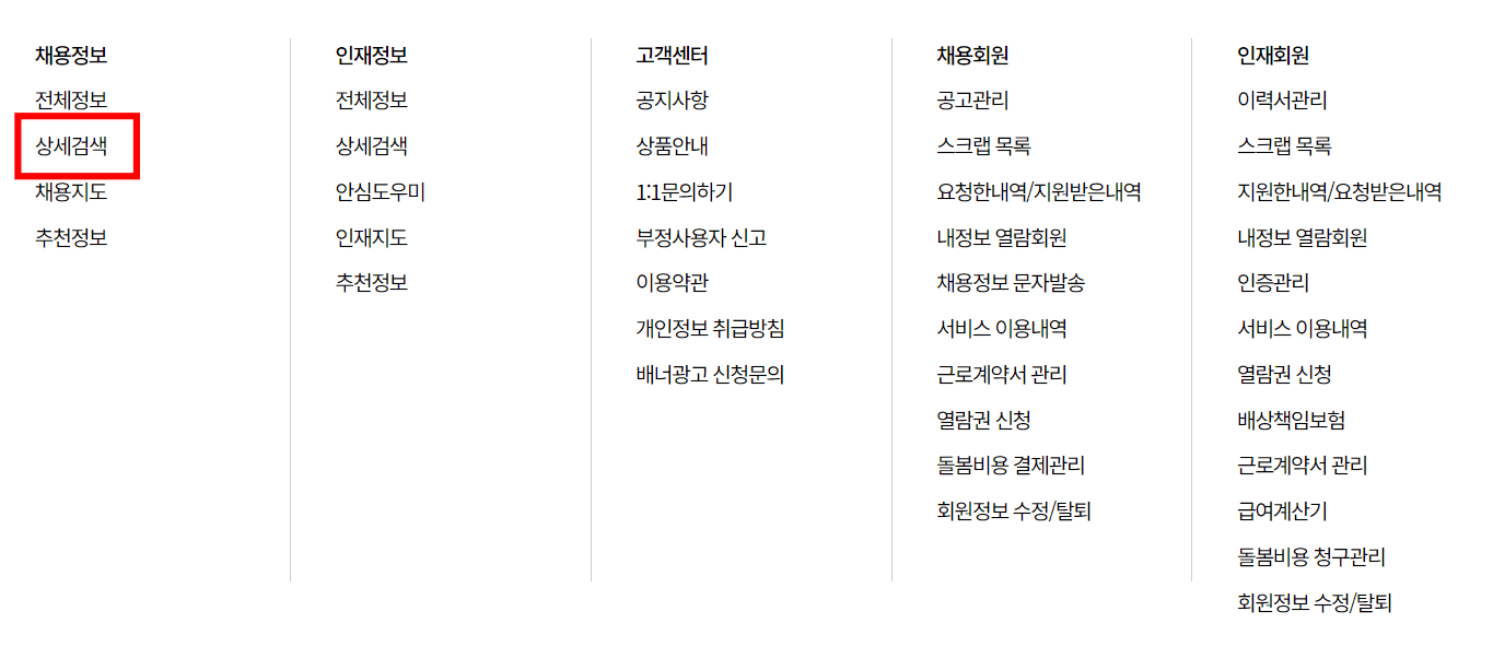 단디헬퍼 홈페이지에 방문하시면 위와 같은 메인 화면을 볼 수 있습니다. 상단 메인 메뉴에서 [채용정보]로 마우스를 가져갑니다. 하단에 세부메뉴가 보이면 [상세검색] 메뉴를 클릭합니다.
