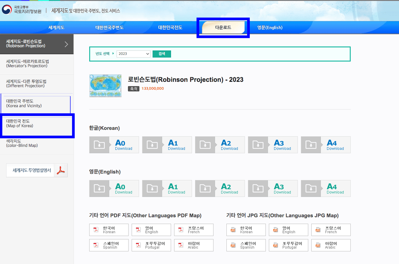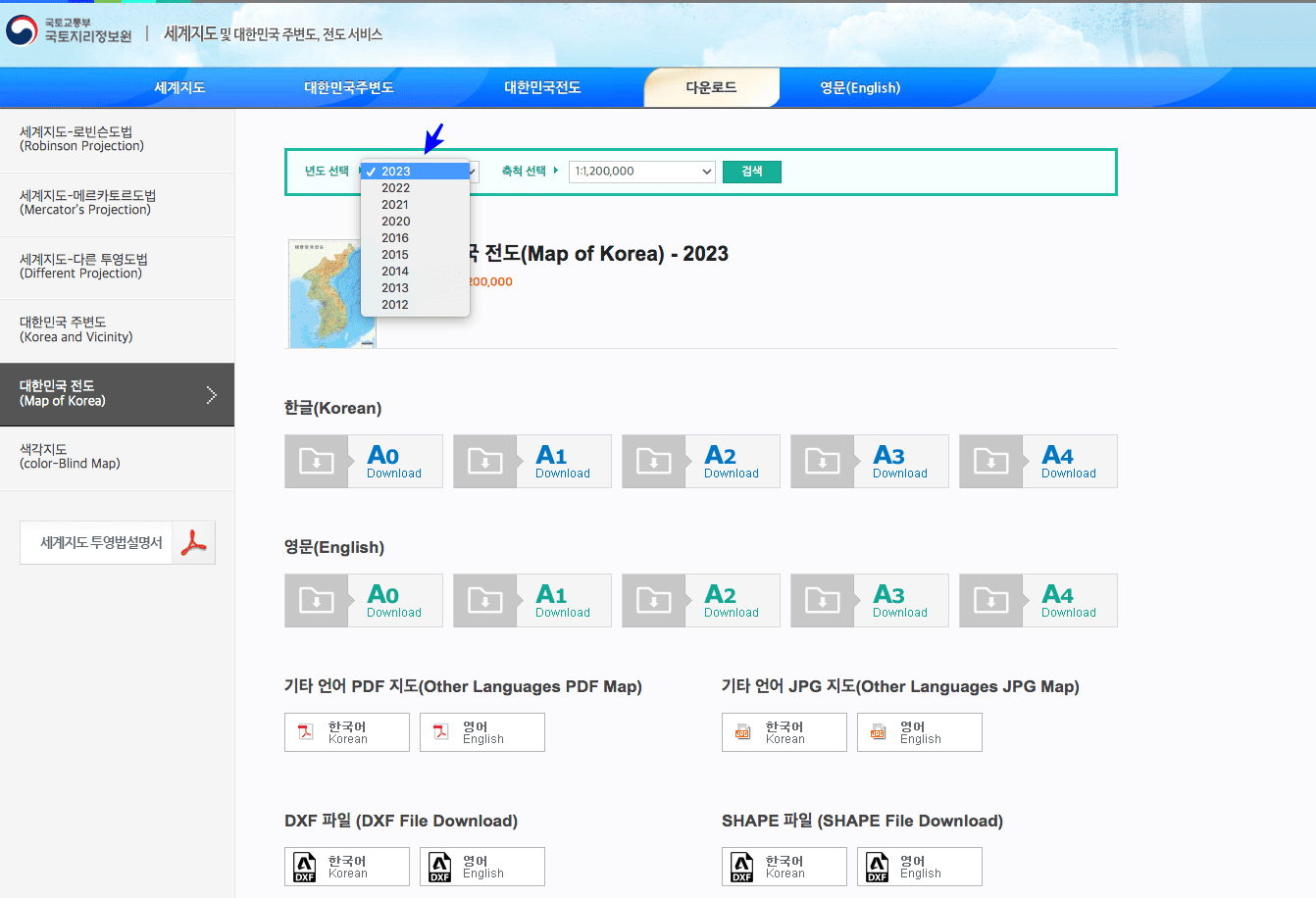 해당 지도를 컴퓨터에 저장하려면 상단메뉴에서 [다운로드]를 클릭합니다. 이후 좌측 메뉴에서 [대한민국 전도] 메뉴를 선택합니다. 대한민국 전도 페이지 상단에서 년도 선택을 클릭하면 2012년부터 2023년까지의 대한민국 지도를 선택합니다.