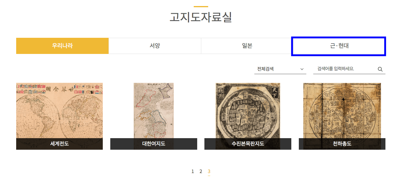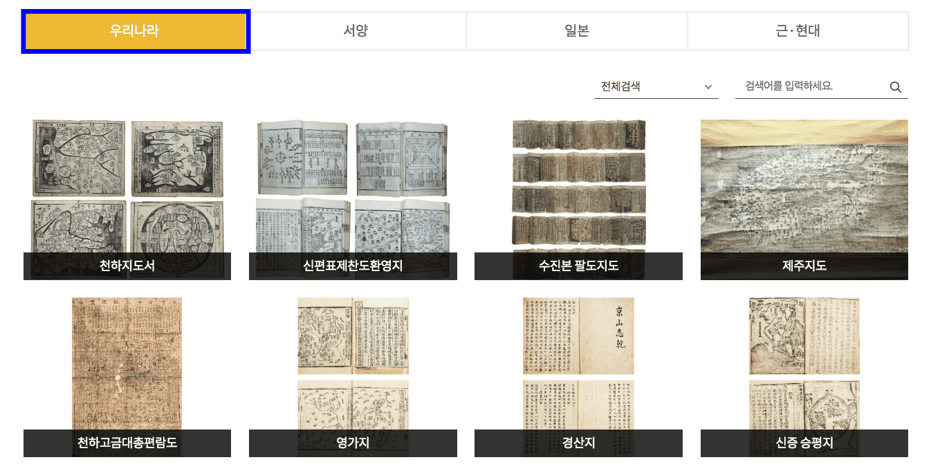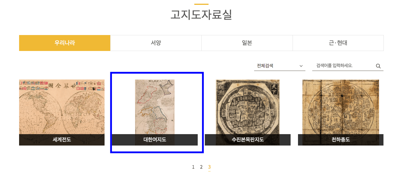 해당 링크로 이동하시면 위와 같이 고지도 자료실에 도착하게 됩니다. 고지도 자료실에는 우리나라 고지도부터 서양, 일본, 근현대 지도까지 확인할 수 있습니다. 우리나라 메뉴를 확인하시면 대한여지도 이미지를 확인할 수 있습니다.