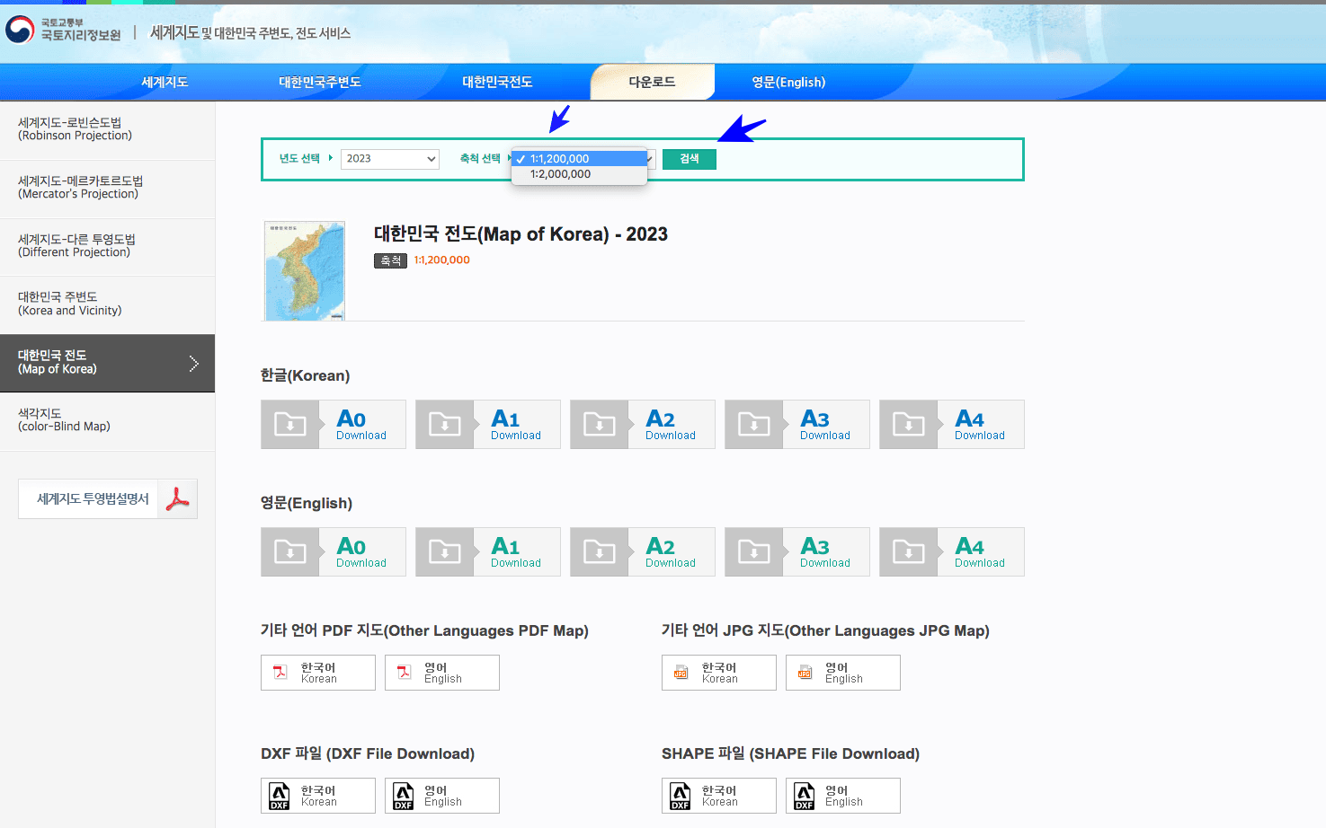 이후 오른쪽에서 축척선택을 클릭하면 1:1,200,000 축척과 1:2,000,000 축척 중 원하는 축척을 선택하고 우측의 검색 버튼을 클릭합니다.