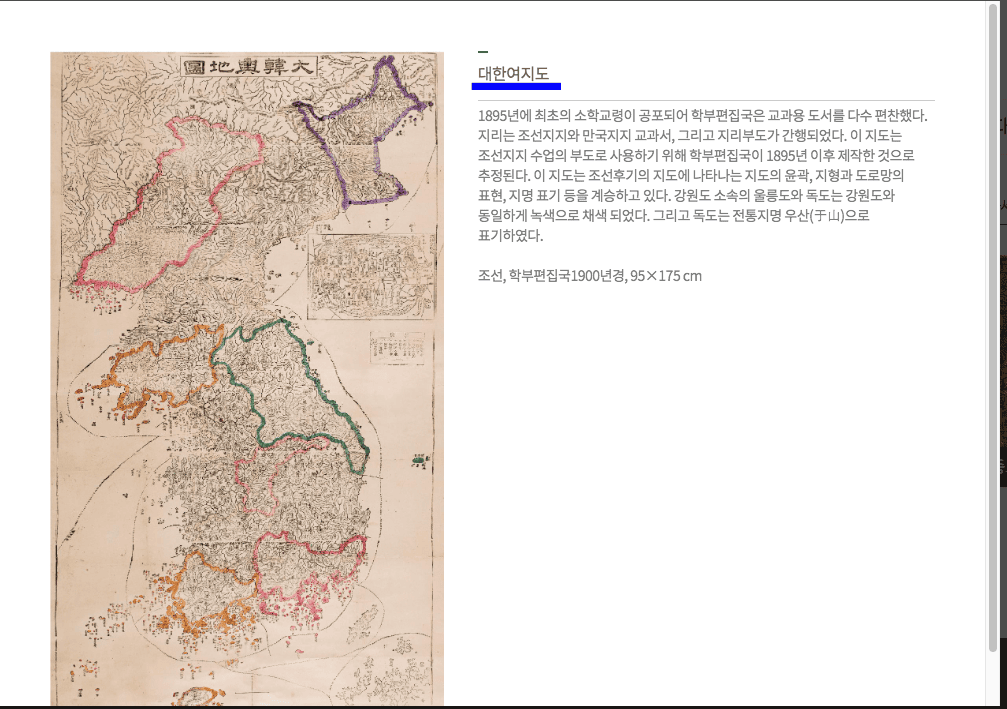 대한여지도는 1995년에 교과용으로 편찬된 지도로 지도의 윤곽과 지형, 도로망 등 현대 지도의 요소를 포함하고 있다고 설명되어 있습니다.