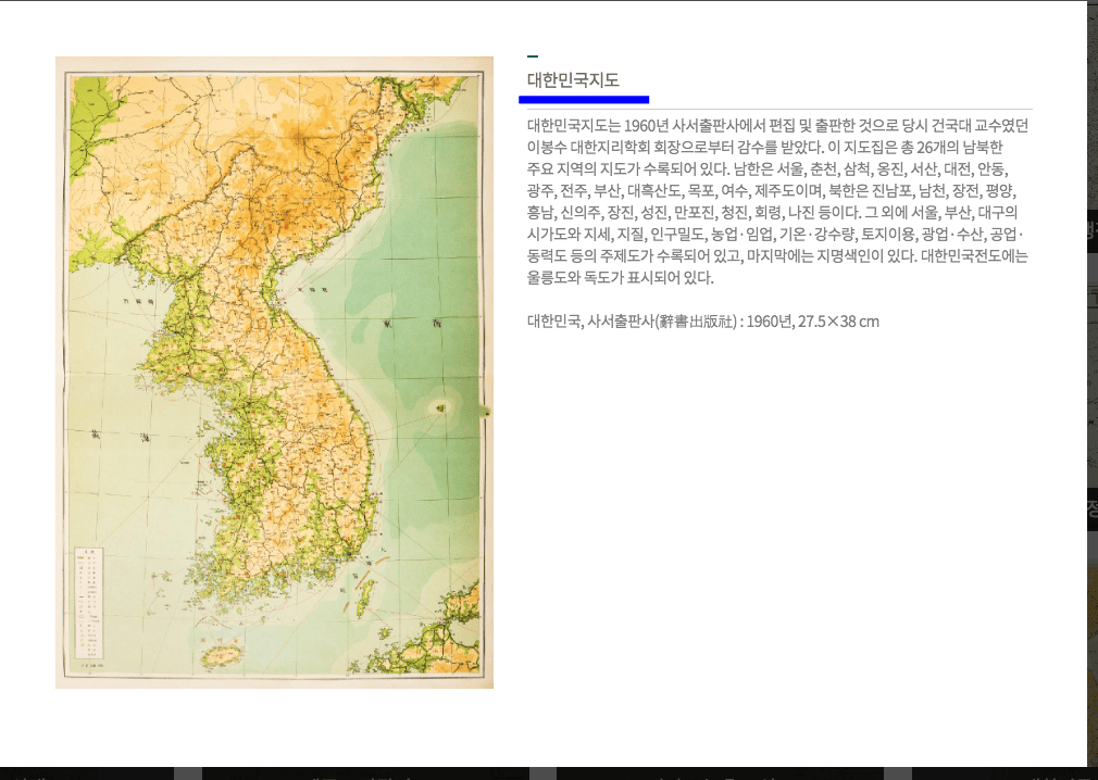 고지도 자료실 메뉴에서 [근현대]를 선택하시면 좀 더 근대의 대한민국 지도를 찾아볼 수 있습니다. 자료 중에서 대한민국지도를 클릭하면 1960년대 사서 출판사에서 출판한 지도로 남북한의 주요 지역 지도를 확인할 수 있습니다.