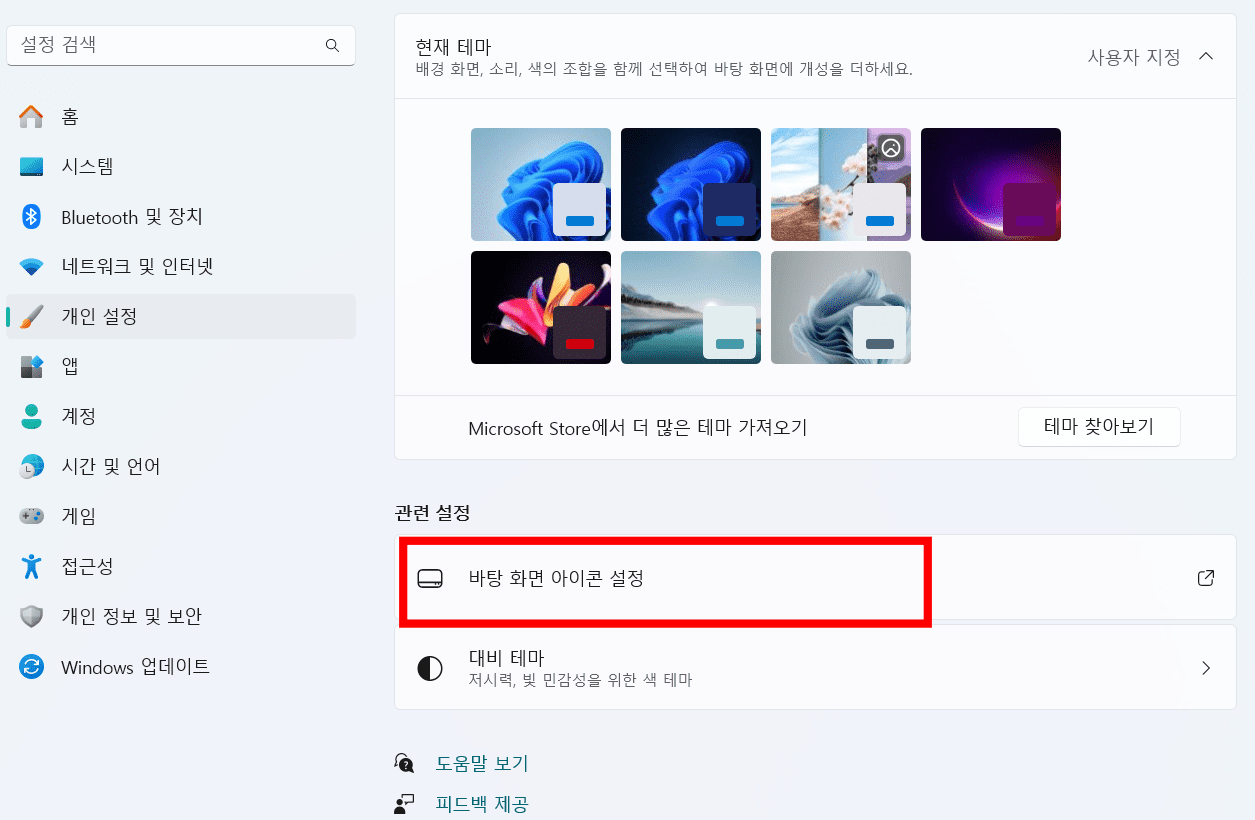 해당 메뉴를 클릭하면 관련설정에서 바탕 화면 아이콘 설정 메뉴를 확인할 수 있습니다. 클릭하도록 합니다.이후 바탕화면 아이콘 설정 화면에 표시되면 내 PC, 휴디통, 네트워크, 휴지통, 제어판 등의 기본 아이콘을 체크하고 하단의 적용버튼을 클릭하면 기본 아이콘이 복구되는 것을 확인해 보시기 바랍니다.
