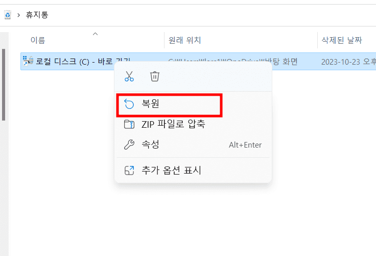바탕화면 아이콘이 사라졌어요 3 - 휴지통 복구