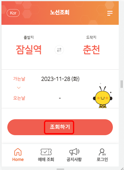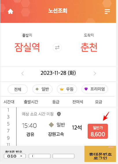 이후 가는날을 확인하시고 하단의 조회하기 버튼을 터치합니다. 이용이 가능한 버스들이 하단에 표시되면 일반가 버튼을 선택합니다. 티켓에 따라 현장 발권이 없는 스마트폰 QR코드로 탑승가능한 전자승차권이 발권될 수 있습니다.