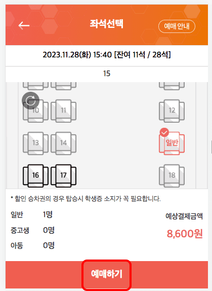 좌석선택에서 원하는 좌석을 선택합니다. 일반, 중고생, 아동 중 자신에게 맞는 유형을 선택합니다. 이후 예상결제금액을 확인하시고 하단의 예매하기 버튼을 터치합니다.