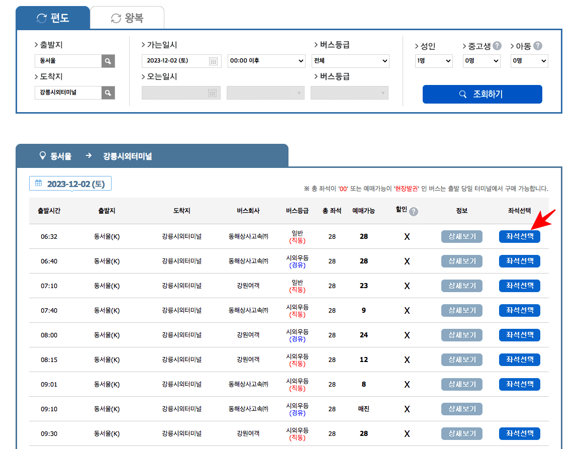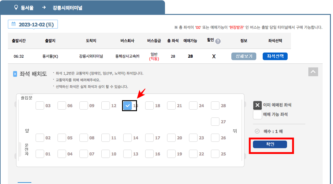 출발지에서 도착지까지의 버스가 검색되면 우측에서 좌석선택 버튼을 클릭합니다. 좌석배치도에서 원하는 좌석을 체크하고 우측에서 확인버튼을 클릭합니다.