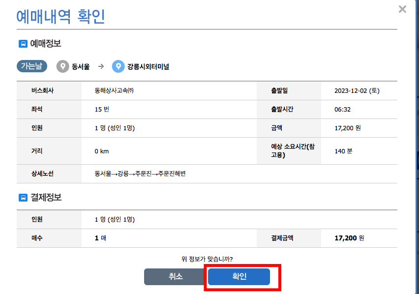 예매내역 확인 페이지가 표시되면 예매정보와 결제정보를 확인하고 하단의 확인버튼을 클릭합니다.