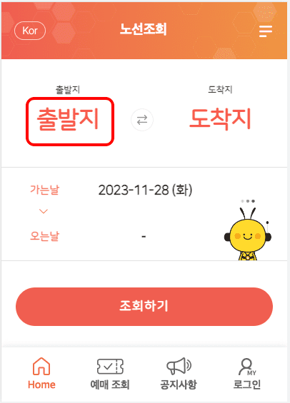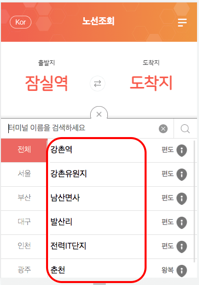 최초 노선조회 화면이 표시되면 출발지를 터치합니다. 터미널 이름을 검색하거나 지역별 터미널을 조회하여 출발지와 도착지를 지정합니다.