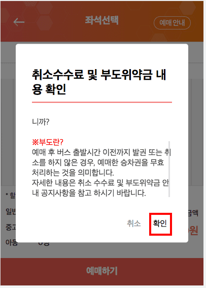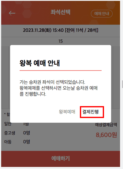 왕복 예매 안내가 표시되면 왕복예매 버튼을 터치하여 정보를 수정하거나 결제진행 버튼을 터치합니다. 취소수수료 및 부도위약금 내용을 확인하고 하단의 확인버튼을 터치합니다.