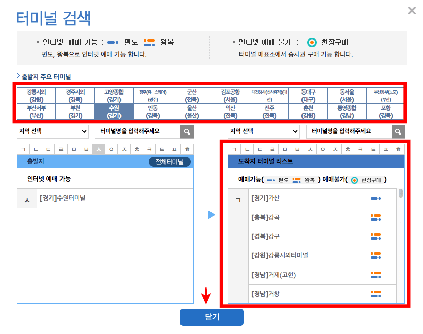 버스타고 홈페이지에 방문하시면 위와 같은 메인 페이지를 볼 수 있습니다. 출발지 우측의 돋보기 아이콘을 클릭합니다. 터미널 검색 페이지가 표시되면 상단의 출발지 주요 터미널에서 출발지를 선택합니다. 이후 우측 하단의 도착지 터미널 리스트에서 도착지를 선택합니다.