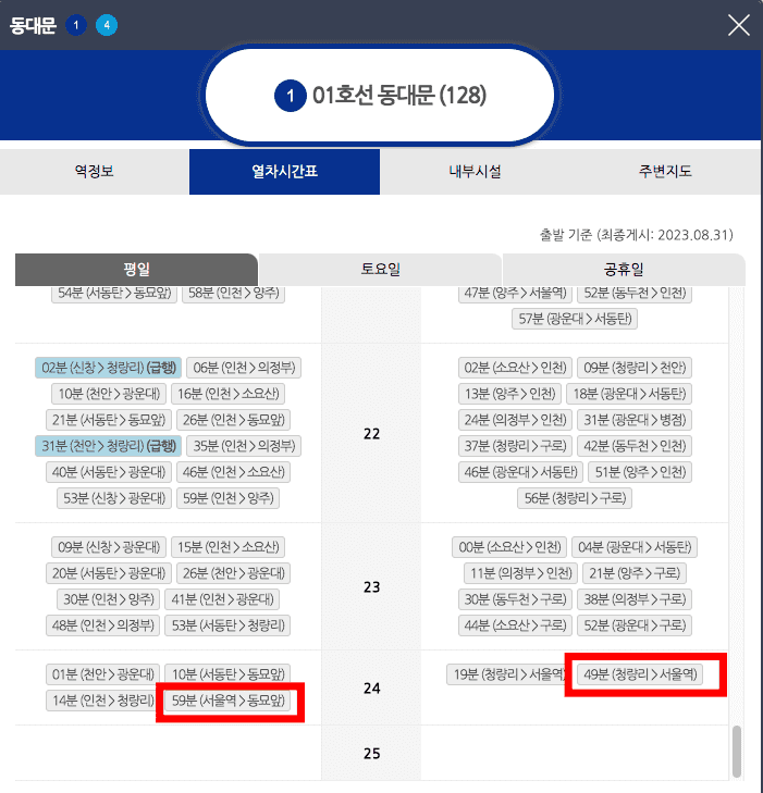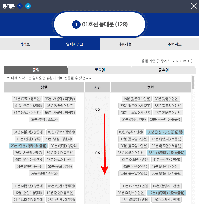 토요일과 공휴일의 막차시간표는 상행 24시 08분 인천> 동묘 앞으로 변경되니 그 점도 유의하시기 바랍니다.