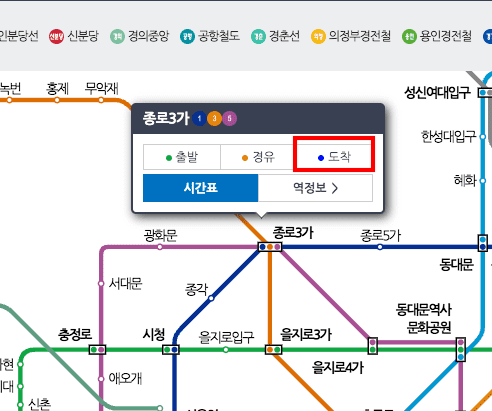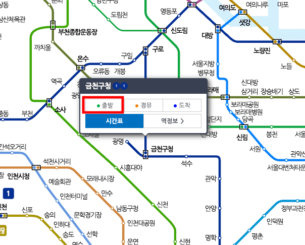 마지막으로 두 가지 노선을 연결한 후 서울 지하철 운행시간표 막차시간을 조회해 보겠습니다. 1호선 금천구청을 노선도에서 선택하고 출발을 클릭합니다. 이번에는 종로 3가를 선택하시고 도착을 클릭합니다.