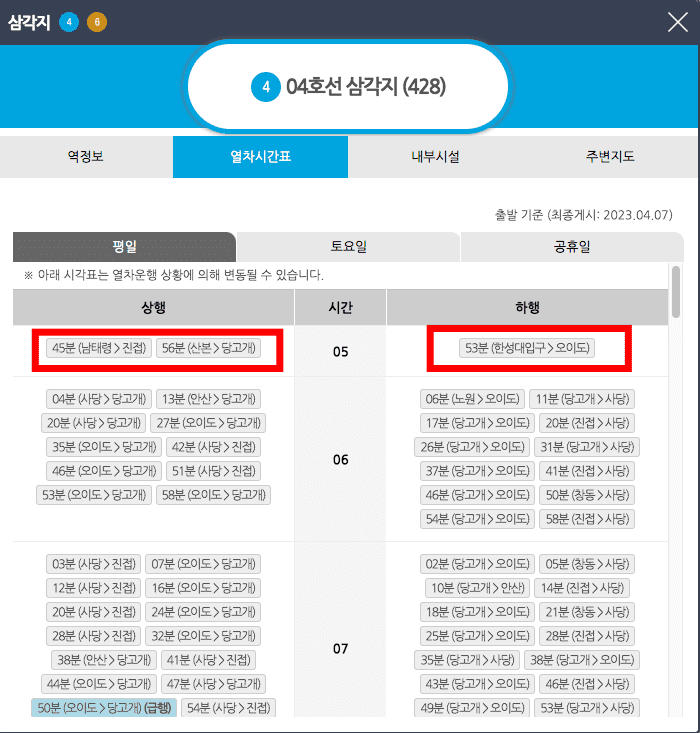 4호선 삼각지역의 평일 상행 첫차 시간표는 상행은 오전 5시 45분 남태령> 진접행, 하행은 오전 5시 53분 한성대입구 > 오이도행임을 확인할 수 있습니다.