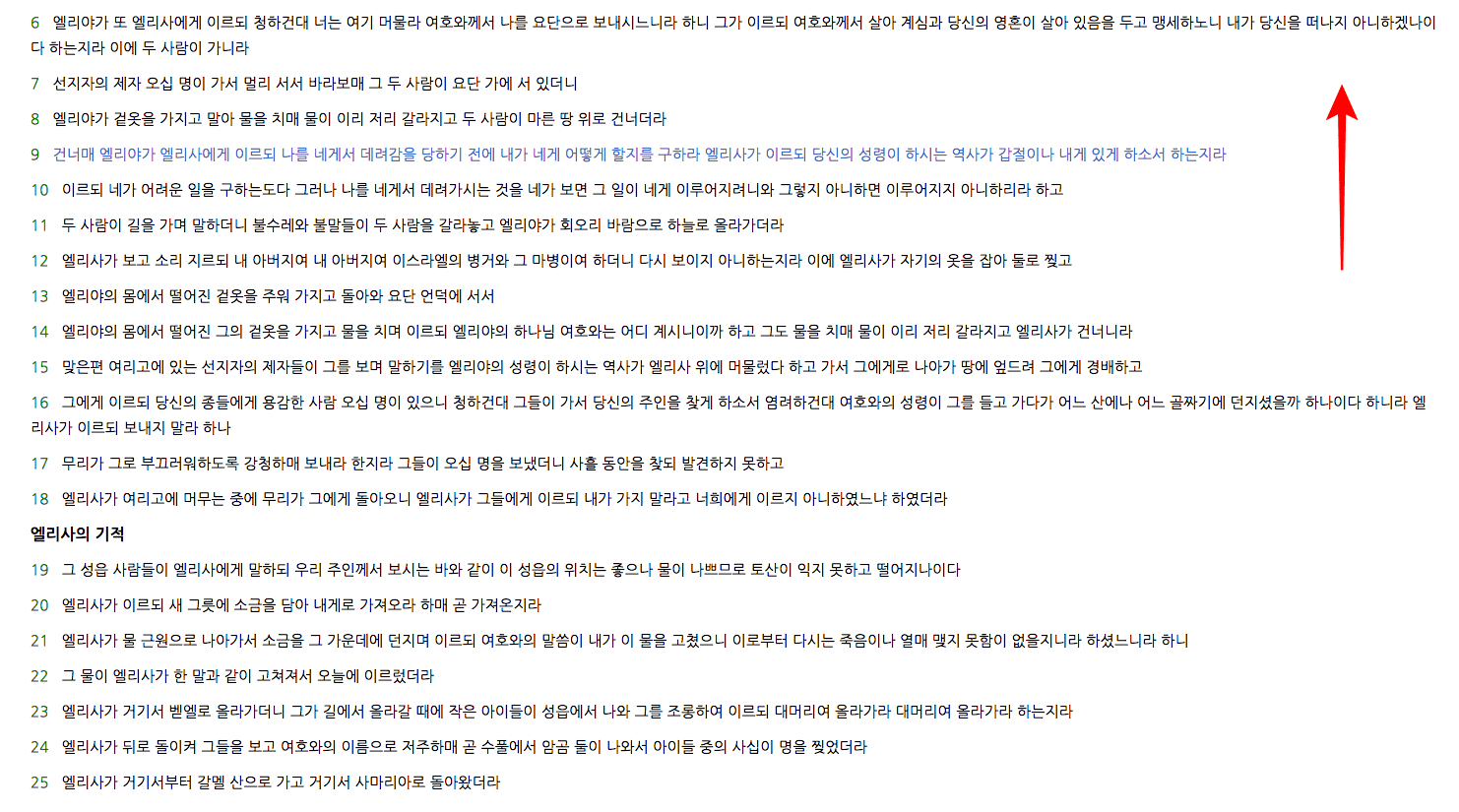 스크롤을 올리면 상단 메뉴가 보여지고 대조역본 선택이 가능합니다. 개역한글판, 표준 새 번역, 공동번역 등 대조해 볼 역본을 선택하고 읽기 버튼을 클릭합니다. 결과를 보시면 열왕기하 2:9에 대한 개역개정과 개역한글의 대조본을 확인할 수 있습니다. 우측 상단의 듣기 버튼을 클릭하면 성경 듣기 창이 활성화되어 청취도 가능합니다.