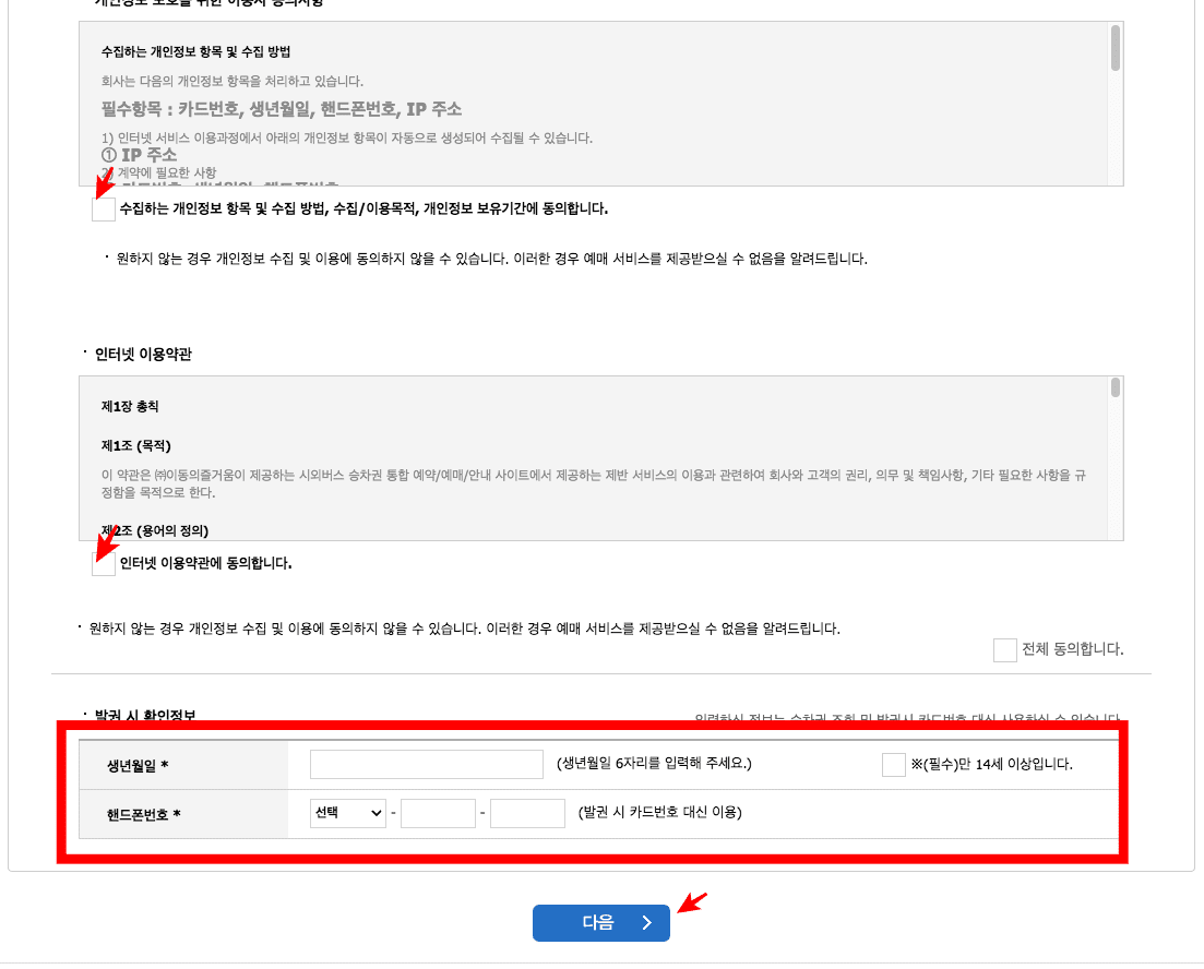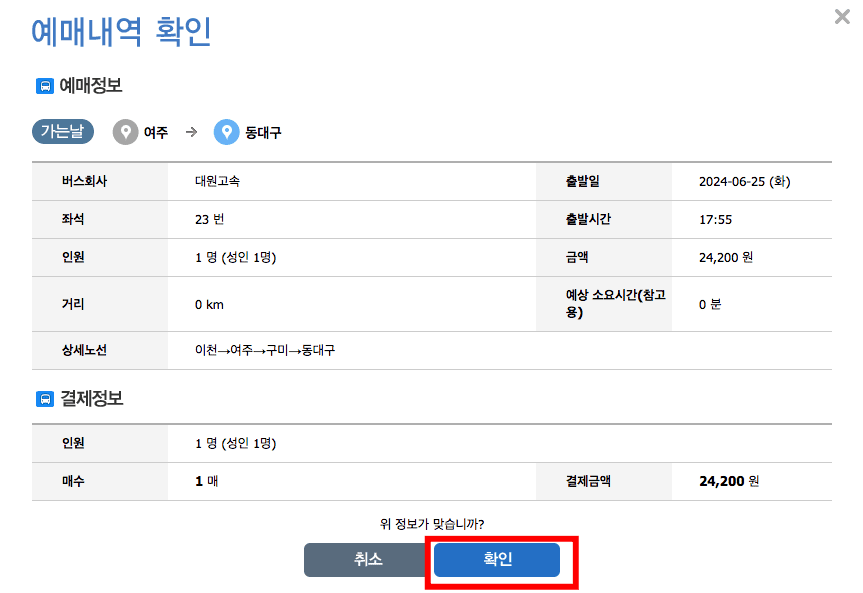 예매내역 확인 페이지에서 여정의 정보와 결제금액을 확인하시고 하단의 확인 버튼을 클릭합니다. 회원인 경우 로그인을 하시고 비회원이라면 개인 정보 항목 및 수집 동의에 표시하시고 하단에 발권 시 확인정보 생년월일, 핸드폰번호를 입력하고 하단의 다음버튼을 클릭하면 결제페이지로 이동되니 직접 확인해 보시기 바랍니다.