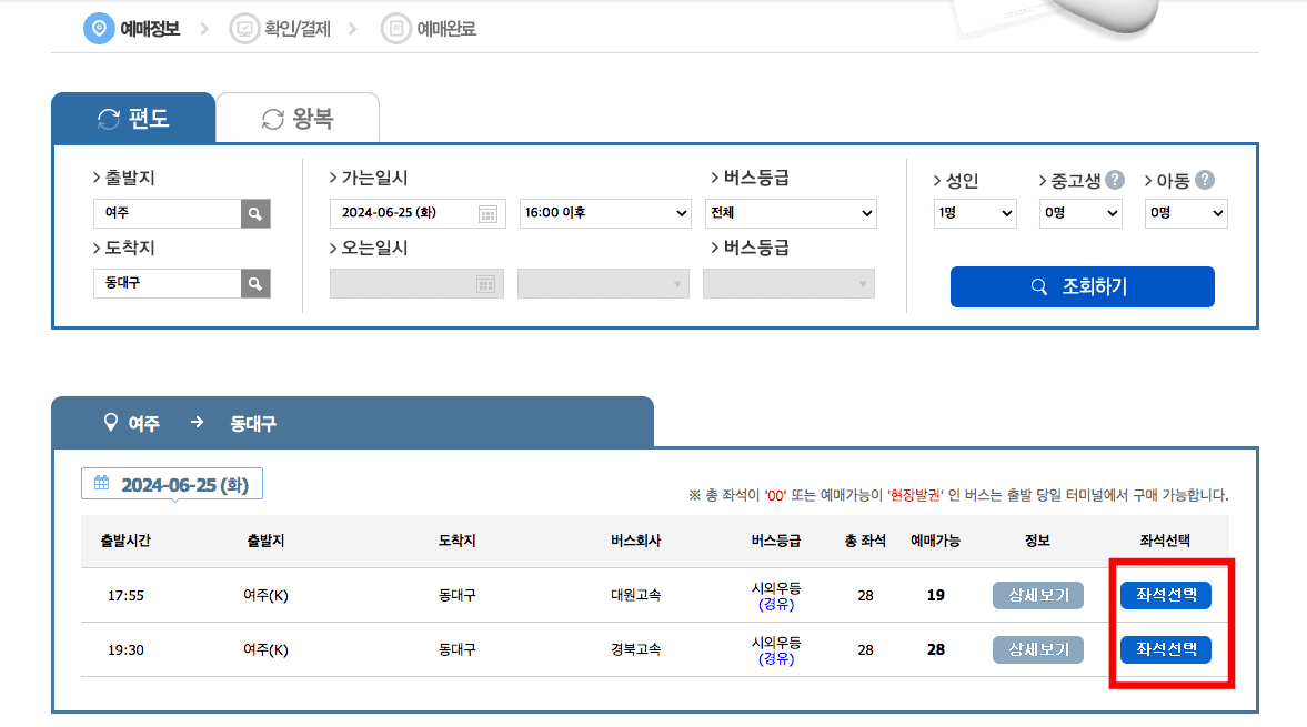 가는 날짜와 출발 시간을 선택하시고 하단의 예매 버튼을 클릭합니다. 예매정보 페이지에서 버스를 확인하시고 우측에서 좌선선택 메뉴를 클릭합니다. 좌석 배치도가 표시되면 X표가 없는 좌석을 선택하고 우측의 표시된 확인 버튼을 클릭합니다.