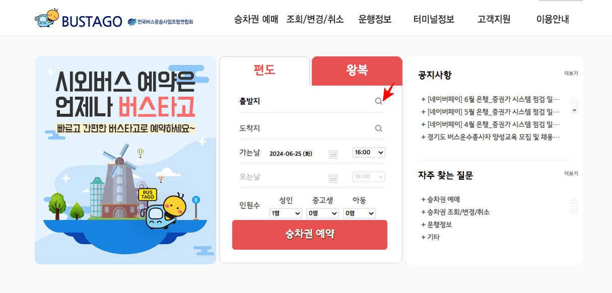 버스타고 홈페이지에 도착하시면 위와 같은 메인 화면을 볼 수 있습니다. 화면 중앙의 메뉴에서 출발지를 마우스로 클릭합니다. 터미널 검색 창이 뜨면 출발지에 여주를 선택하시고 우측에서 도착지를 입력하거나 하단에서 선택합니다.