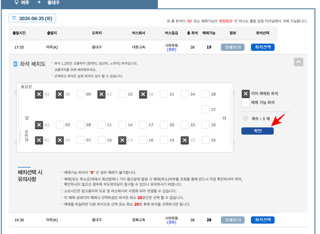 가는 날짜와 출발 시간을 선택하시고 하단의 예매 버튼을 클릭합니다. 예매정보 페이지에서 버스를 확인하시고 우측에서 좌선선택 메뉴를 클릭합니다. 좌석 배치도가 표시되면 X표가 없는 좌석을 선택하고 우측의 표시된 확인 버튼을 클릭합니다.