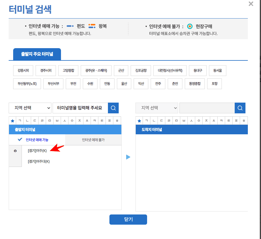 버스타고 홈페이지에 도착하시면 위와 같은 메인 화면을 볼 수 있습니다. 화면 중앙의 메뉴에서 출발지를 마우스로 클릭합니다. 터미널 검색 창이 뜨면 출발지에 여주를 선택하시고 우측에서 도착지를 입력하거나 하단에서 선택합니다.
