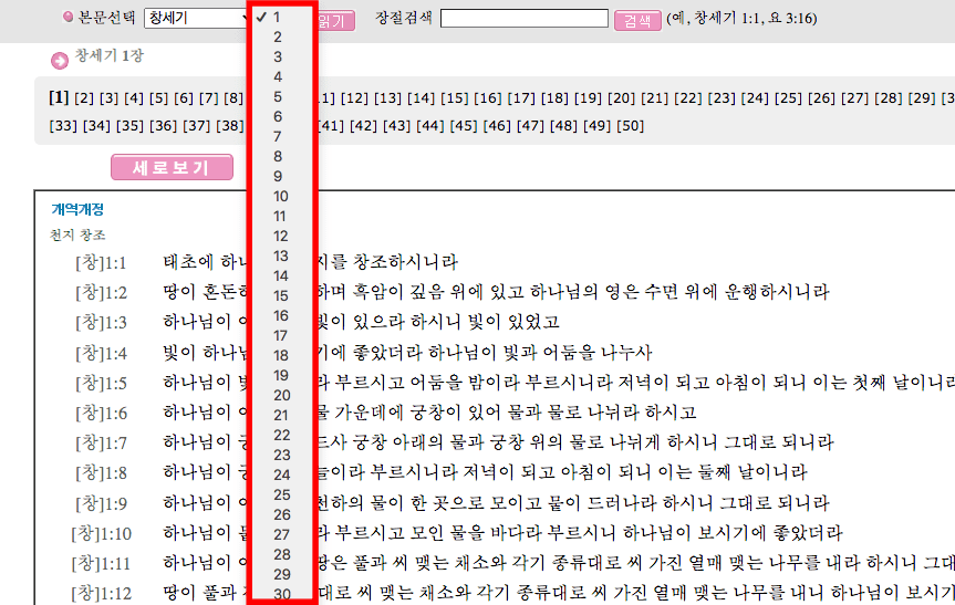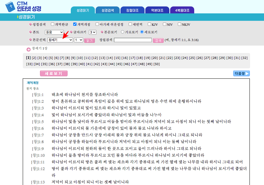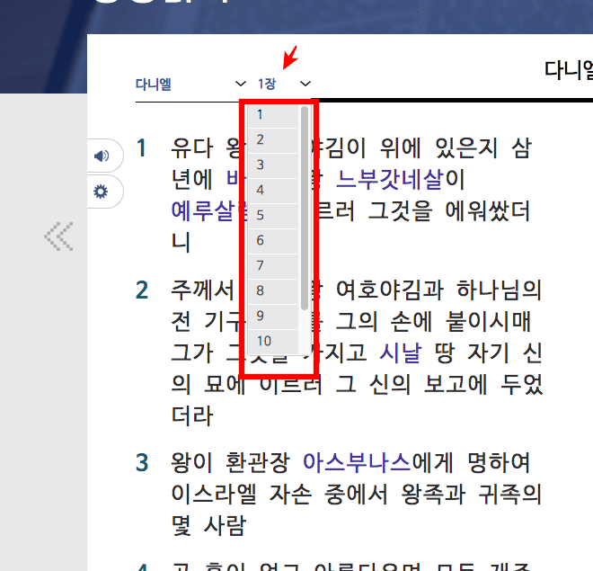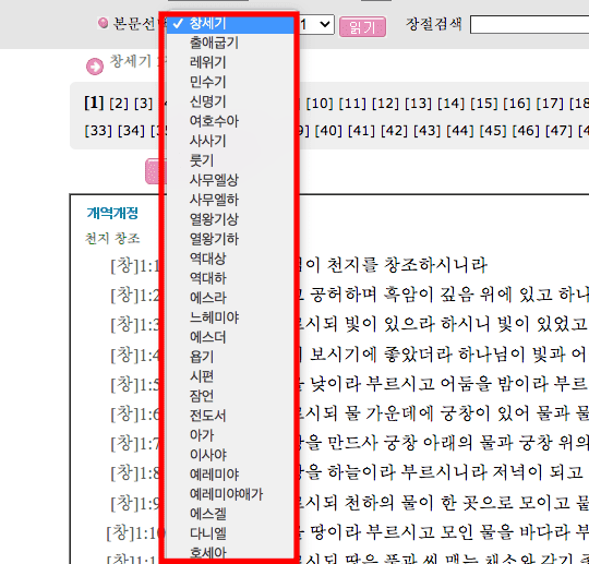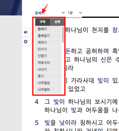 성경 읽기 페이지가 표시되면 상단의 본문 선택 메뉴를 클릭하여 파트를 선택할 수 있습니다. 마찬가지로 우측의 장 메뉴를 선택하면 모든 장으로 이동이 가능합니다.