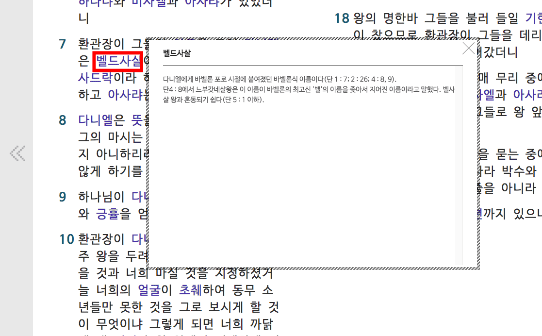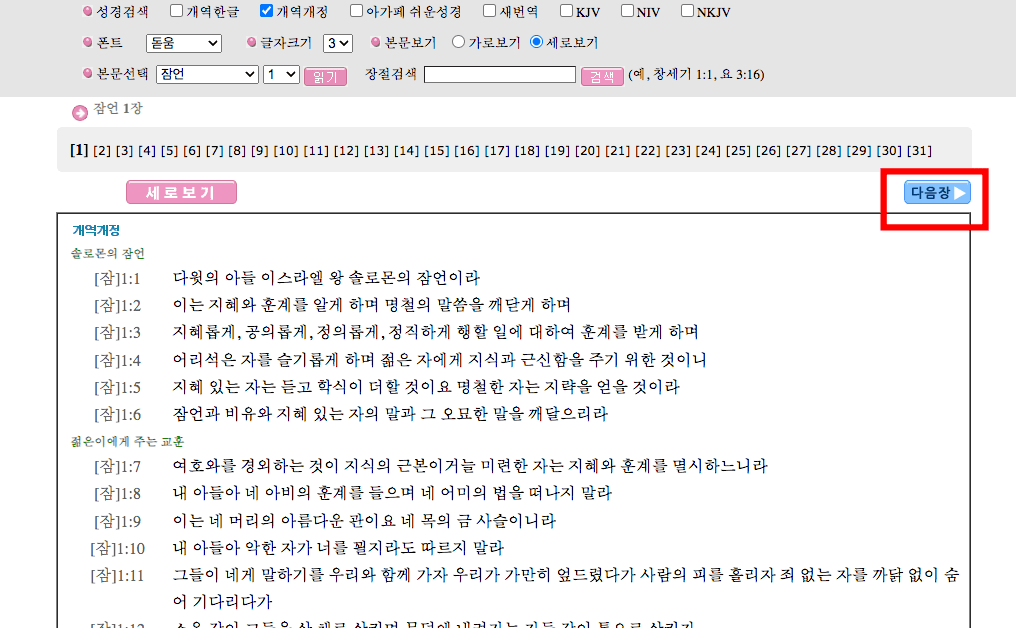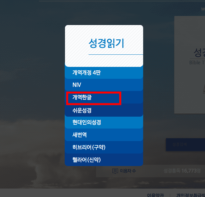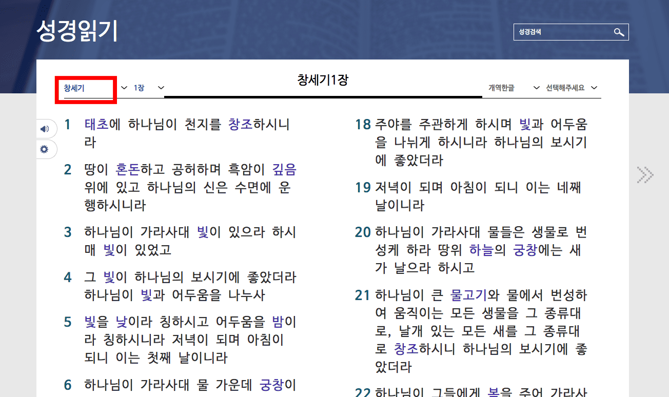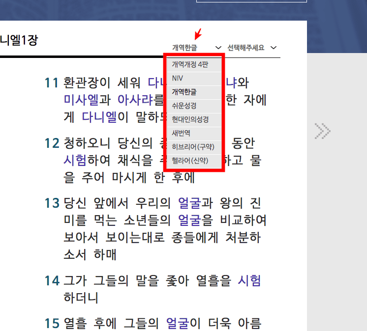 좌측 상단의 개역한글 메뉴를 선택하면 다른 버전의 성경을 선택할 수 있습니다. 성경을 읽다가 모르는 단어가 남색 글씨로 되어 있는 것이 있다면 클릭해 봅니다. 그 단어에 대한 성경적인 의미를 확인할 수 있습니다.