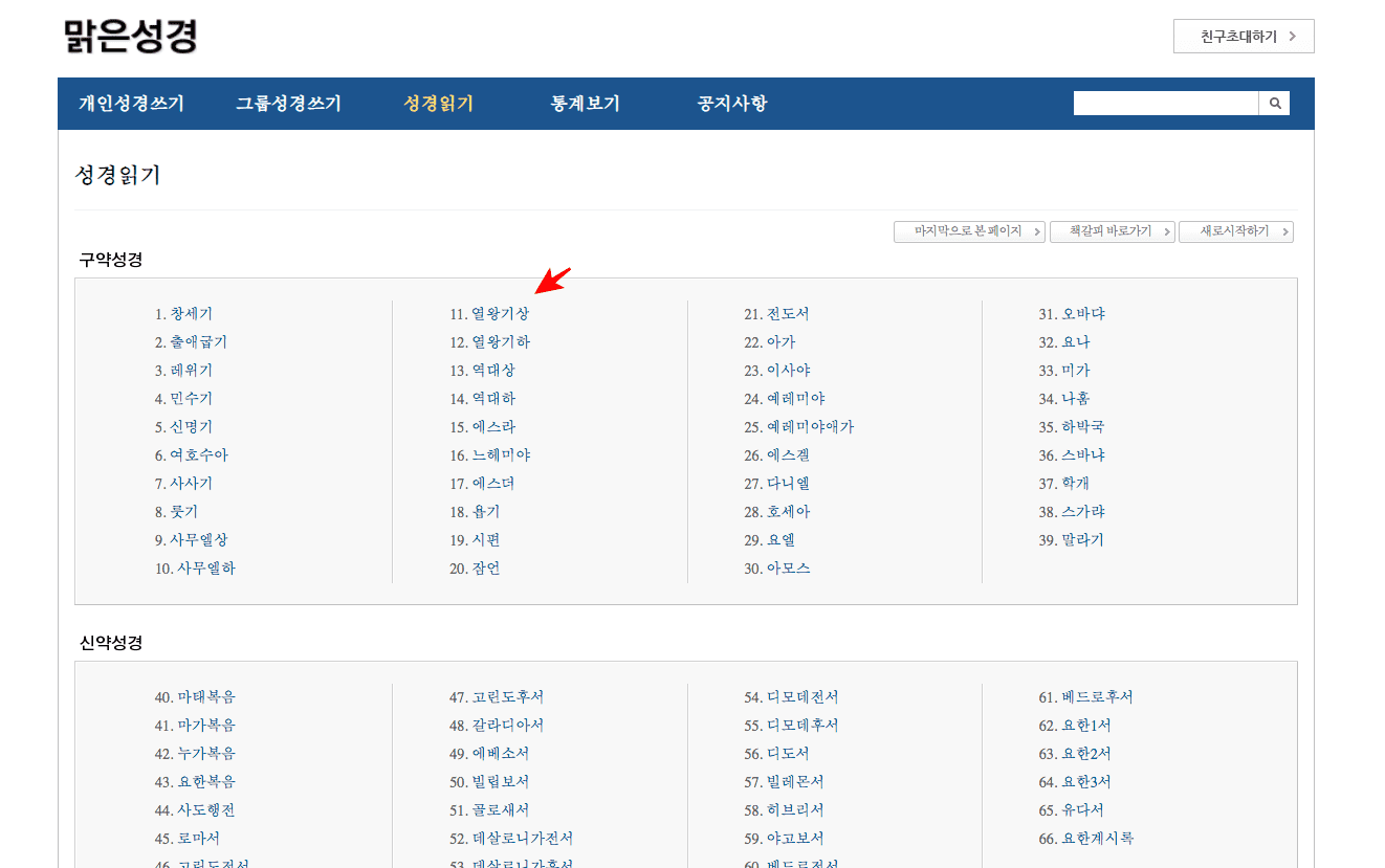 맑은 성경에 방문하시면 위와 같은 메인 화면을 보게 됩니다. 구약성경과 신약성경 중 원하는 파트를 선택합니다. 이번에는 열왕기상을 읽어보도록 하겠습니다.