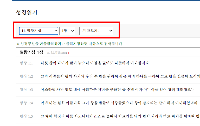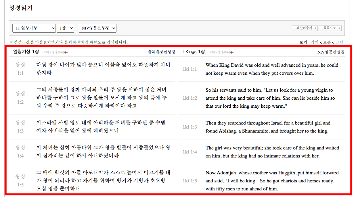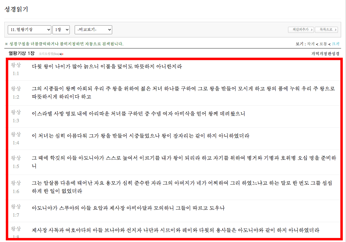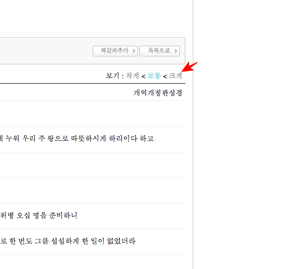 열왕기상이 화면에 나타나면 위에서 아래로 성경을 읽어나가면 됩니다. 상단의 메뉴에서 성경의 파트와 장 선택이 가능합니다. 만약 글씨가 작게 느껴진다면 좌측 상단 메뉴의 보기 메뉴에서 [크게]를 선택하도록 합니다.