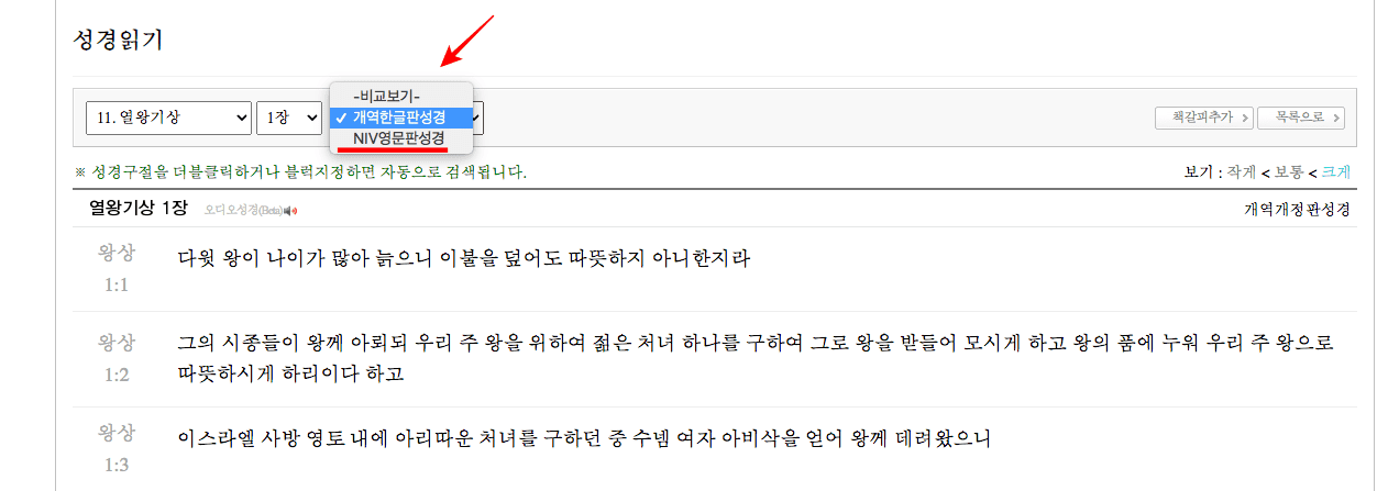 좌측 상단 메뉴에서 비교보기를 선택한 후 NIV 영문판성경을 선택하면 개역개정판 성경과 영문판 성경을 비교해 보면서 성경을 읽을 수 있습니다. 우리나라에 처음으로 들어온 성경은 분명히 영문판이었을 것이니 영문으로 보는 것도 느낌이 다른 것 같습니다.