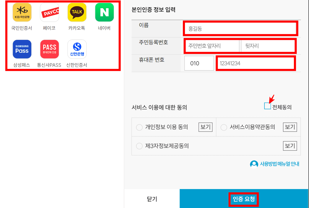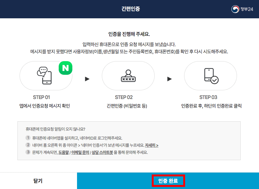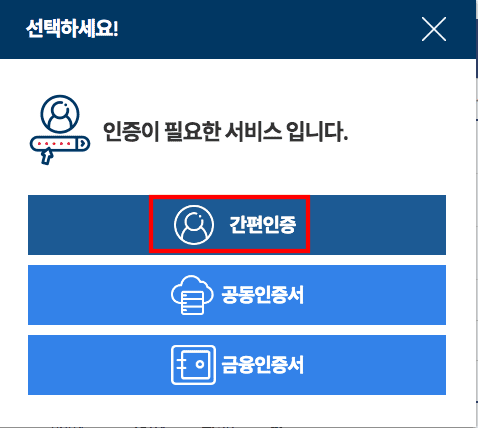 간편 인증, 공동인증, 금융인증 중 보유한 인증 수단을 선택합니다. 간편 인증의 경우 왼쪽에서 보유한 민간 인증서 선택 후 이름, 주민등록번호, 휴대폰 번호, 서비스 이용에 대한 전체도의 후 하단의 인증 요청 버튼을 클릭합니다. 휴대폰에서 인증을 완료하고 컴퓨터에서 인증완료 버튼을 선택합니다.